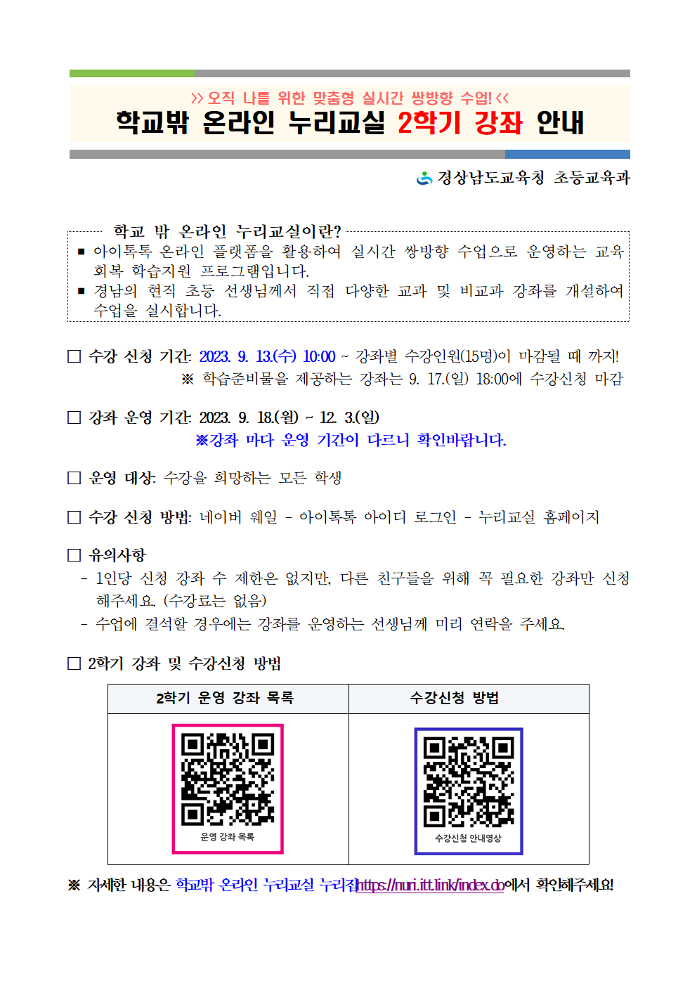학교 밖 온라인 누리교실 2학기 강좌 안내