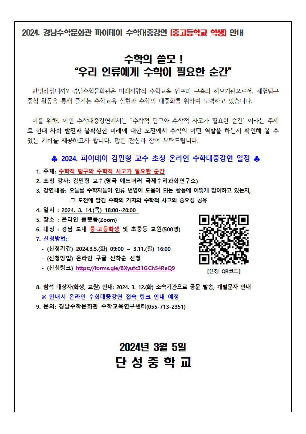 2024. 경남수학문화관 파이데이 수학대중강연 안내