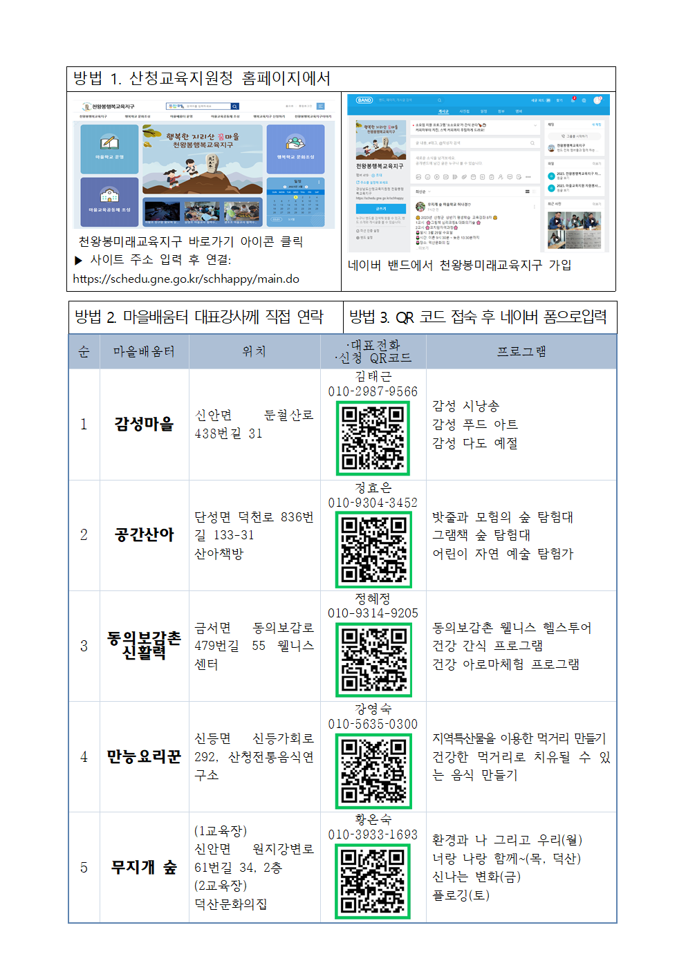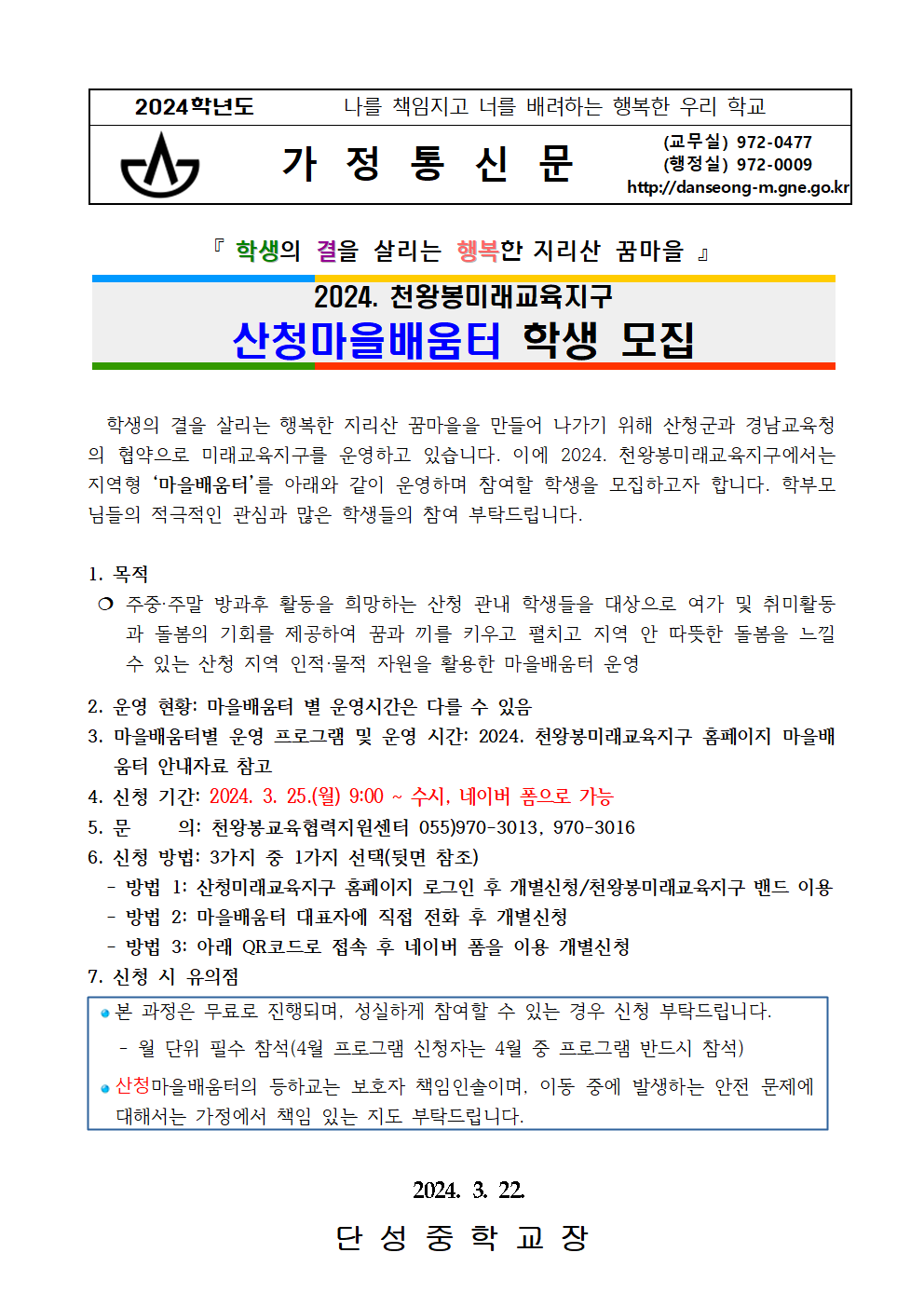 2024. 천왕봉미래교육지구 산청마을배움터 학생 모집 안내
