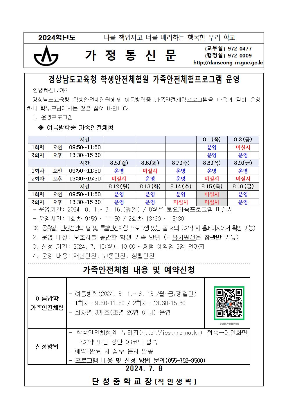 학생안전체험원 가족안전체험프로그램 운영(가정통신문)
